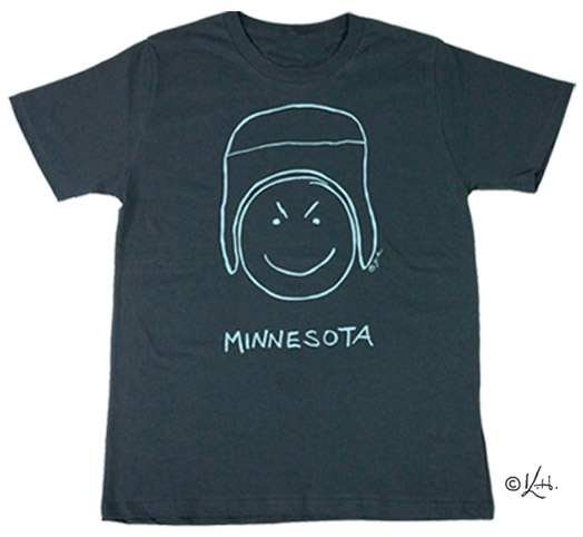 To people who live in Minnesota, this shirt design speaks for itself. It is based on a spontaneous drawing that Josh Methven, Kara’s fiance, created one day after a long shift at a retail job. Frustrated at the passive-aggressive behavior of certain customers that he encountered on a daily basis, Josh drew this little logo on a piece of paper and called it the Minnesota State Flag. It hung on the fridge for a while until one day Kara suggested printing it on T-shirts. She re-formatted the drawing into a screen design, and handed it to a local screen printer who hand screen prints each shirt.